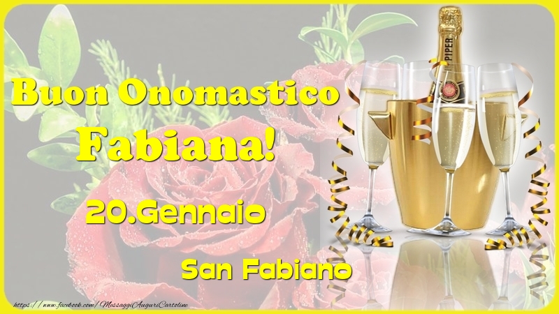 Buon Onomastico Fabiana! 20.Gennaio - San Fabiano | Cartolina con champagne e bicchieri su sfondo di rose rosse | Cartoline di onomastico