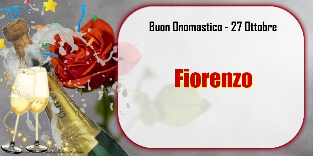Cartolina con nome Fiorenzo di onomastico con champagne con bicchieri su sfondo di rose e frase di buon onomastico Buon Onomastico, Fiorenzo! 27 Ottobre.