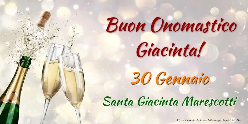 Cartolina con nome Giacinta di onomastico con champagne che si apre e frase di buon onomastico Buon Onomastico Giacinta! 30 Gennaio Santa Giacinta Marescotti.