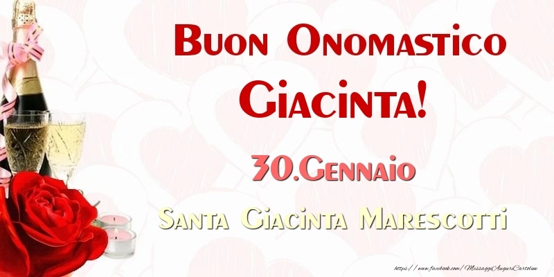 Cartolina con nome Giacinta di onomastico con rosa rossa e champagne e frase di buon onomastico Buon Onomastico Giacinta! 30.Gennaio Santa Giacinta Marescotti.