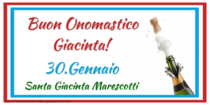 Buon Onomastico Giacinta! 30.Gennaio Santa Giacinta Marescotti | Cartolina con champagne con bordo blu e rosso | Cartoline di onomastico