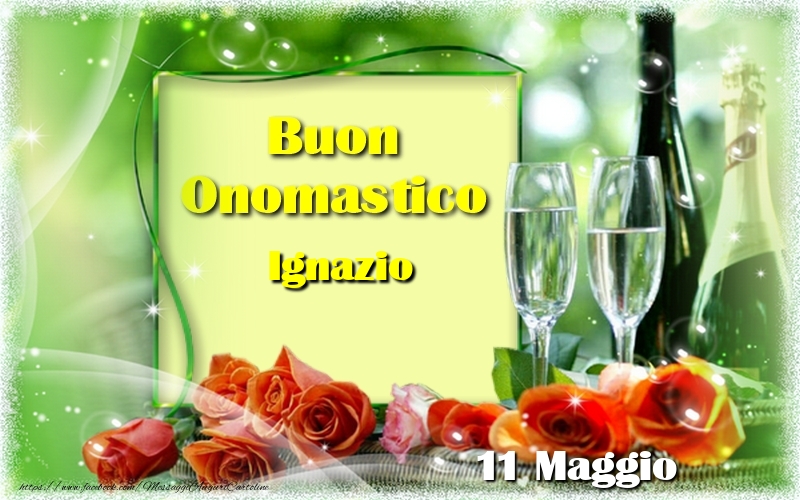 Buon Onomastico Ignazio! 11 Maggio | Cartolina con rose e champagne su sfondo verde | Cartoline di onomastico
