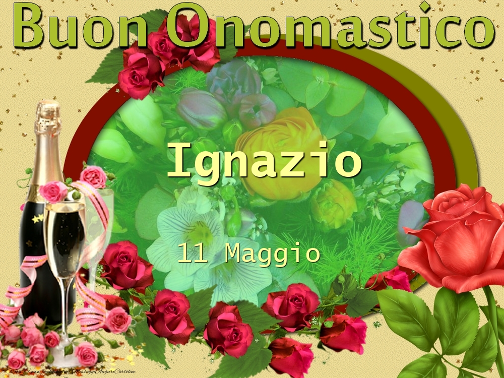 Buon Onomastico, Ignazio! 11 Maggio | Cartolina con champagne con composizione floreale | Cartoline di onomastico