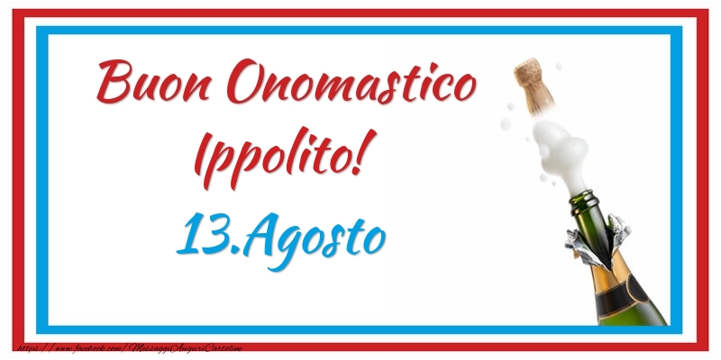 Buon Onomastico Ippolito! 13.Agosto | Cartolina con champagne con bordo blu e rosso | Cartoline di onomastico