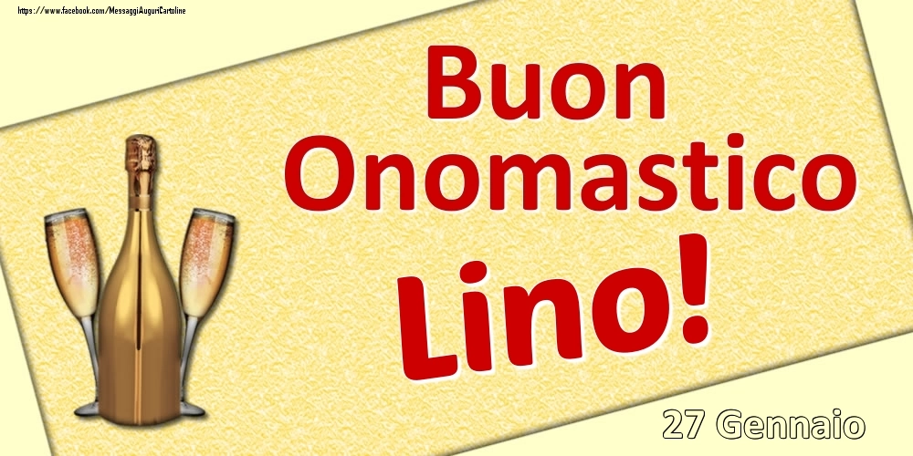 Scopri questa cartolina con disegno di champagne con bicchieri unica e personalizzata per la festa dell'onomastico e preparati a condividere un momento di gioia e felicità con il destinatario. Che tu stia inviando il messaggio a distanza o desideri sorprendere la persona amata, questo biglietto di auguri con il nome Lino renderà la festa dell'onomastico davvero speciale e memorabile. Questo biglietto di auguri di onomastico con nome Lino può essere scaricata gratis o inviare tramite Whatsapp, Facebook, Twitter, Pinterest. Immagine di buon onomastico con disegno di champagne con bicchieri e dimensioni 1000px x 500px.