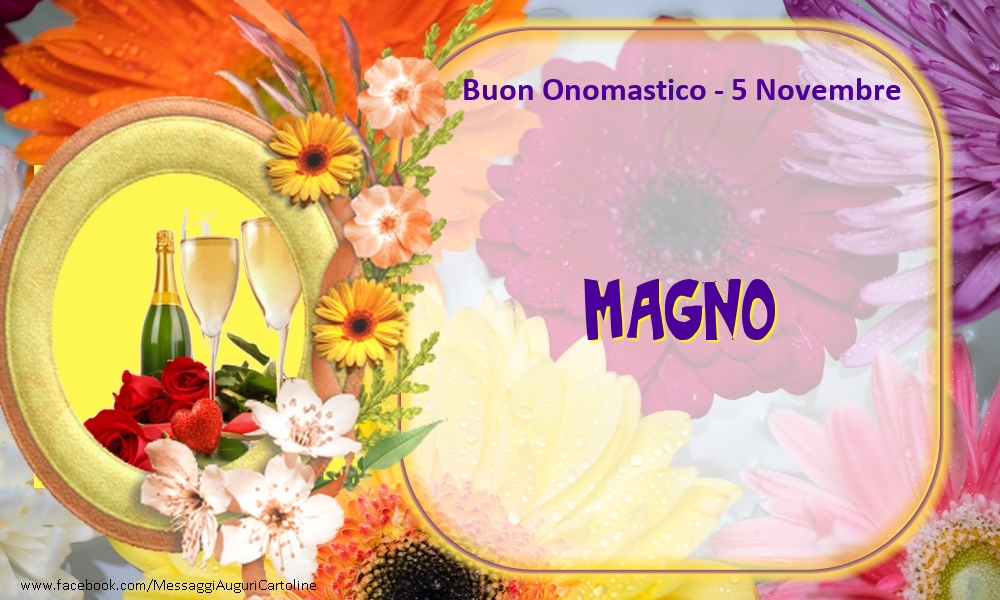 Buon Onomastico, Magno! 5 Novembre | Cartolina con champagne su sfondo floreale | Cartoline di onomastico