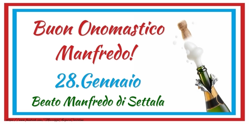 Buon Onomastico Manfredo! 28.Gennaio Beato Manfredo di Settala | Cartolina con champagne con bordo blu e rosso | Cartoline di onomastico