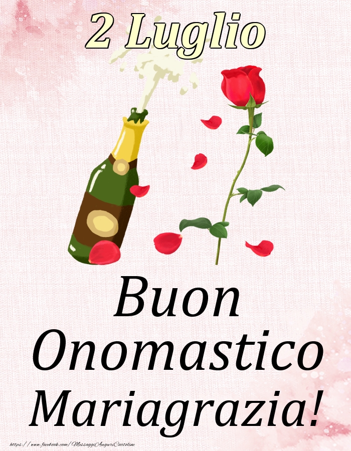 Buon Onomastico Mariagrazia! - 2 Luglio | Cartolina con disegno con champagne e rosa | Cartoline di onomastico