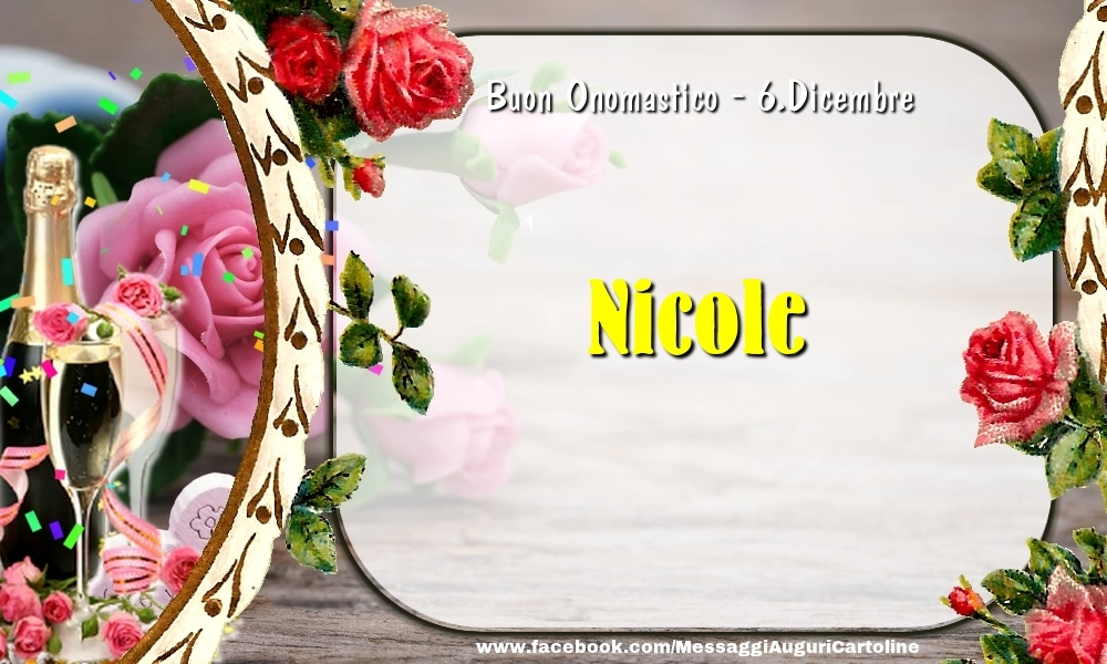 Buon Onomastico, Nicole! 6.Dicembre | Cartolina con champagne con rose sullo sfondo | Cartoline di onomastico