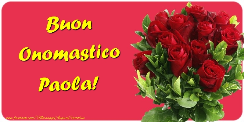 Buon Onomastico Paola | Cartolina con bouquet di rose rosse su sfondo rosso | Cartoline di onomastico