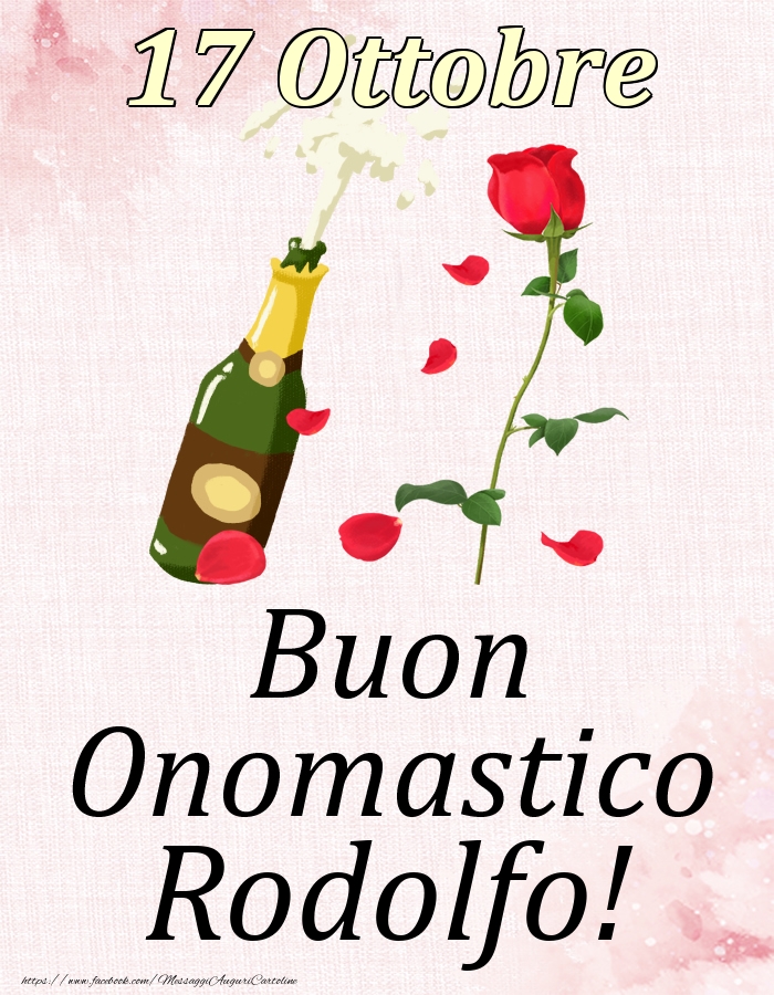 Buon Onomastico Rodolfo! - 17 Ottobre | Cartolina con disegno con champagne e rosa | Cartoline di onomastico