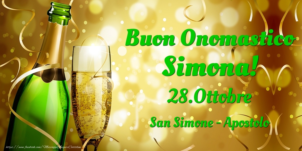 Buon Onomastico Simona! 28.Ottobre - San Simone - Apostolo | Cartolina con champagne con bicchiere e coriandoli | Cartoline di onomastico