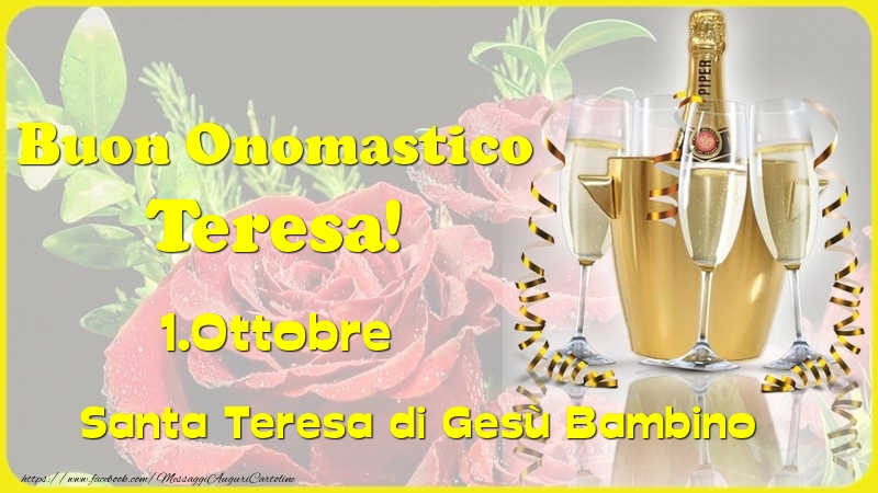 Buon Onomastico Teresa! 1.Ottobre - Santa Teresa di Gesù Bambino | Cartolina con champagne e bicchieri su sfondo di rose rosse | Cartoline di onomastico