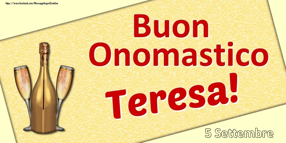 Buon Onomastico Teresa! - 5 Settembre | Cartolina con disegno di champagne con bicchieri | Cartoline di onomastico