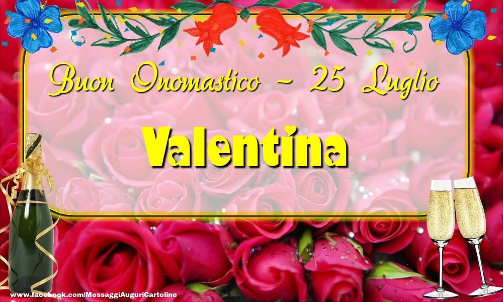 Scopri questa cartolina con champagne con rose rosse sullo sfondo unica e personalizzata per la festa dell'onomastico e preparati a condividere un momento di gioia e felicità con il destinatario. Che tu stia inviando il messaggio a distanza o desideri sorprendere la persona amata, questo biglietto di auguri con il nome Valentina renderà la festa dell'onomastico davvero speciale e memorabile. Questo biglietto di auguri di onomastico con nome Valentina può essere scaricata gratis o inviare tramite Whatsapp, Facebook, Twitter, Pinterest. Immagine di buon onomastico con champagne con rose rosse sullo sfondo e dimensioni 1000px x 600px.