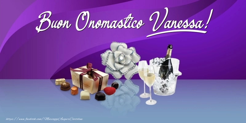 Scopri questa cartolina con champagne, fiori e regalo unica e personalizzata per la festa dell'onomastico e preparati a condividere un momento di gioia e felicità con il destinatario. Che tu stia inviando il messaggio a distanza o desideri sorprendere la persona amata, questo biglietto di auguri con il nome Vanessa renderà la festa dell'onomastico davvero speciale e memorabile. Questo biglietto di auguri di onomastico con nome Vanessa può essere scaricata gratis o inviare tramite Whatsapp, Facebook, Twitter, Pinterest. Immagine di buon onomastico con champagne, fiori e regalo e dimensioni 800px x 400px.