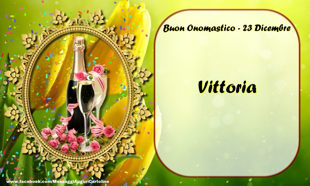 Buon Onomastico, Vittoria! 23 Dicembre | Cartolina con champagne e rose | Cartoline di onomastico