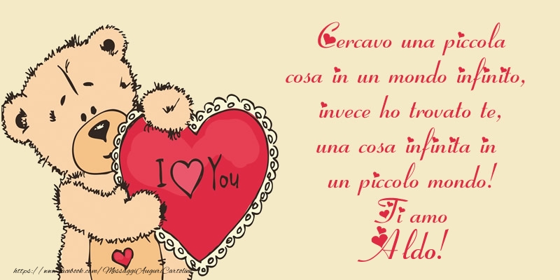 Cercavo una piccola cosa in un mondo infinito, invece ho trovato te, una cosa infinita in un piccolo mondo! Ti amo Aldo! | Cartolina con orsacchiotto con cuore | Cartoline d'amore