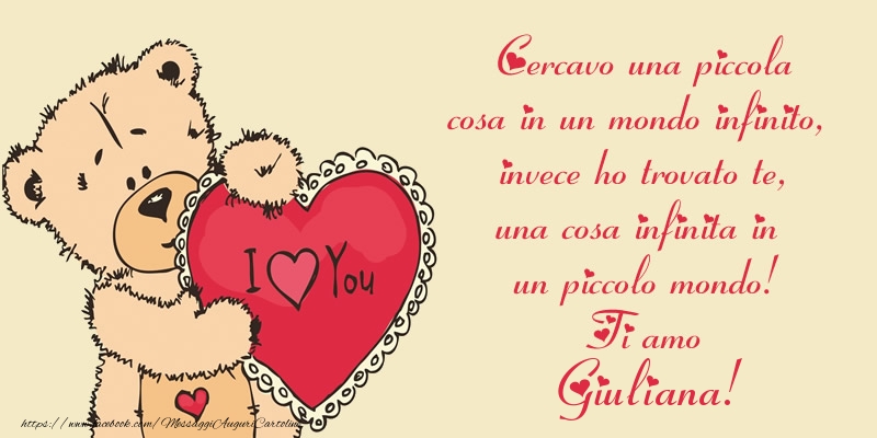 Cercavo una piccola cosa in un mondo infinito, invece ho trovato te, una cosa infinita in un piccolo mondo! Ti amo Giuliana! | Cartolina con orsacchiotto con cuore | Cartoline d'amore