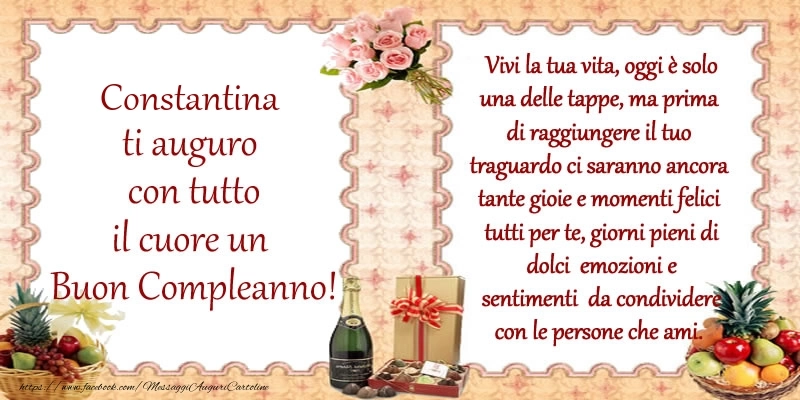Constantina ti auguro con tutto il cuore un Buon Compleanno! | Cartolina con fiori, frutta e champagne | Cartoline di compleanno