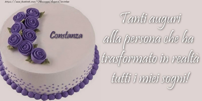 Cartolina con nome Constanza di compleanno con torta blu con rose su sfondo grigio e frase di buon compleanno Constanza Tanti auguri alla persona che ha trasformato in realtà tutti i miei sogni!.