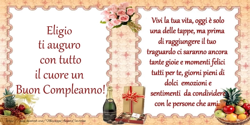 Eligio ti auguro con tutto il cuore un Buon Compleanno! | Cartolina con fiori, frutta e champagne | Cartoline di compleanno