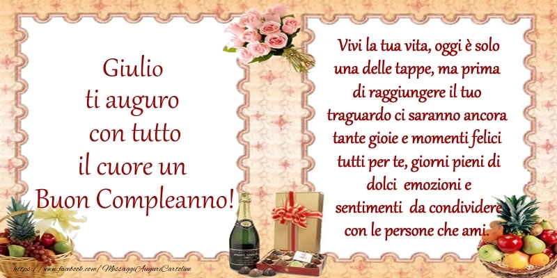 Giulio ti auguro con tutto il cuore un Buon Compleanno! | Cartolina con fiori, frutta e champagne | Cartoline di compleanno