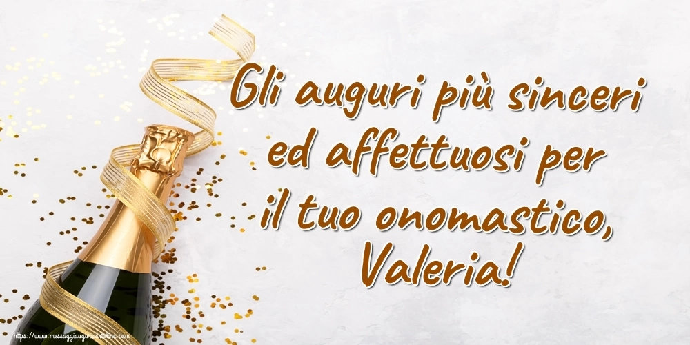Gli auguri più sinceri ed affettuosi per il tuo onomastico, Valeria! | Cartolina con champagne e coriandoli per uomini o donne | Cartoline di onomastico