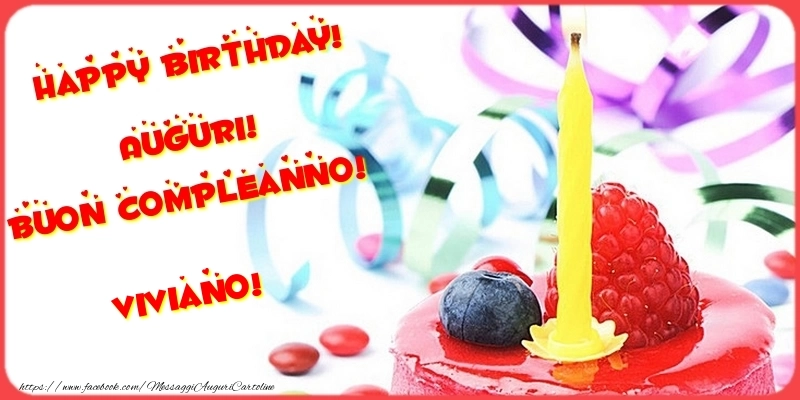 Cartolina con nome Viviano di compleanno con torta di frutta con auguri in inglese e frase di buon compleanno Happy birthday! Auguri! Buon Compleanno! Viviano.