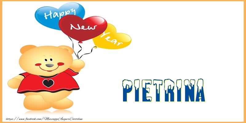 Happy New Year Pietrina! | Cartolina con orsetto divertente con palloncini con Happy New Year | Cartoline di buon anno