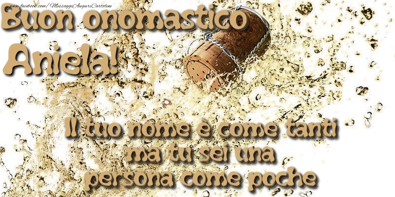 Cartolina con nome Aniela di onomastico con tappo di champagne e frase di buon onomastico Il tuo nome è come tanti ma tu sei una persona come poche. Buon onomastico Aniela.