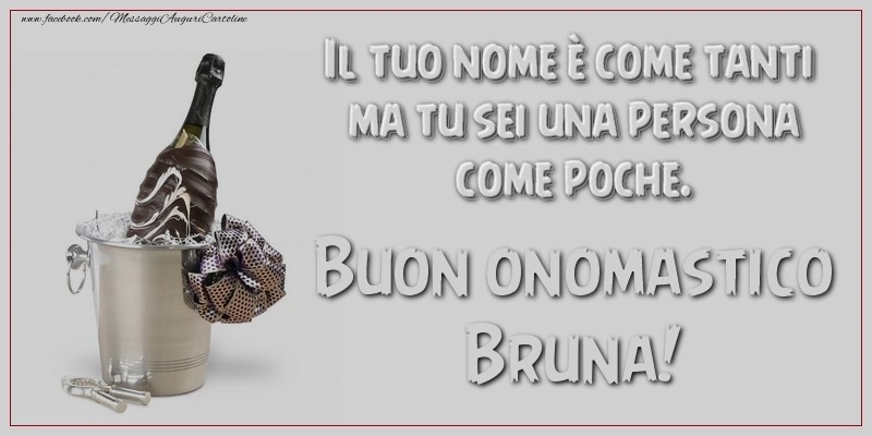 Il tuo nome è come tanti ma tu sei una persona come poche. Buon onomastico, Bruna | Cartolina con champagne su sfondo grigio | Cartoline di onomastico