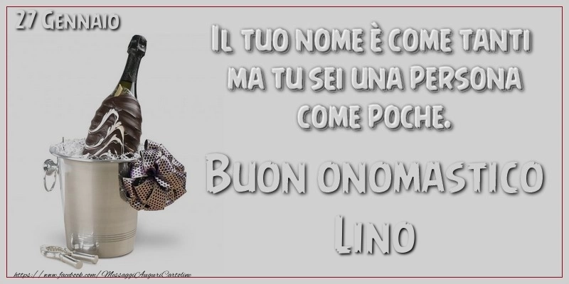 Cartolina con nome Lino di onomastico con champagne su sfondo grigio e frase di buon onomastico Il tuo nome è come tanti ma tu sei una persona come poche. Buon Onomastico Lino! 27 Gennaio.