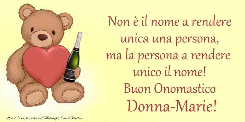 Cartolina con nome Donna-Marie di onomastico con orsetto con cuore e champagne e frase di buon onomastico Non è il nome a rendere unica una persona, ma la persona a rendere unico il nome! Buon Onomastico Donna-Marie!.