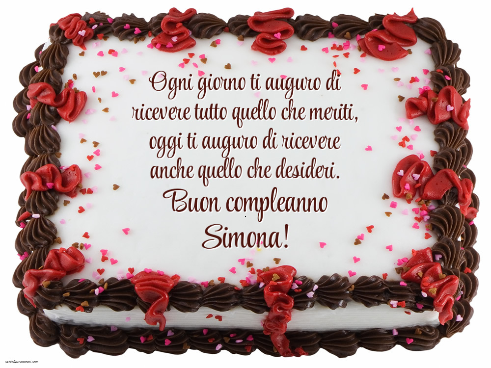 Ogni giorno ti auguro di ricevere tutto quello che meriti, oggi ti auguro di ricevere anche quello che desideri. Buon compleanno Simona! | Cartolina con torta con decorazioni | Cartoline di compleanno