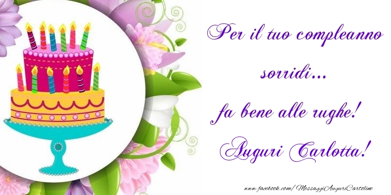 Per il tuo compleanno sorridi... fa bene alle rughe! Carlotta | Cartolina con disegno con torta e fiori | Cartoline di auguri