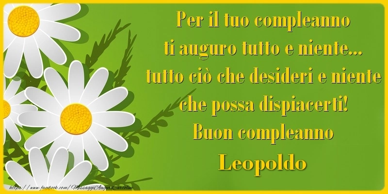 Per il tuo compleanno ti auguro tutto e niente... tutto ciò che desideri e niente che possa dispiacerti! Buon compleanno Leopoldo | Cartolina con fiori giallo-bianchi su sfondo verde | Cartoline di compleanno