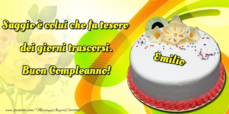 Cartolina con nome Emilio di compleanno con torta su sfondo con rose e frase di buon compleanno Saggio è colui che fa tesoro dei giorni trascorsi. Buon Compleanno! Emilio.