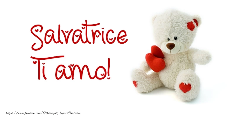 Salvatrice Ti amo! | Cartolina con orsetto con cuori rossi su sfondo bianco | Cartoline d'amore