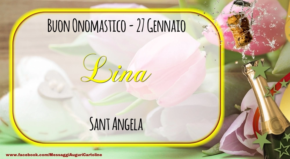 Cartolina con nome Lina di onomastico con champagne con tulipani e cuori sullo sfondo e frase di buon onomastico Sant Angela Buon Onomastico, Lina! 27 Gennaio.