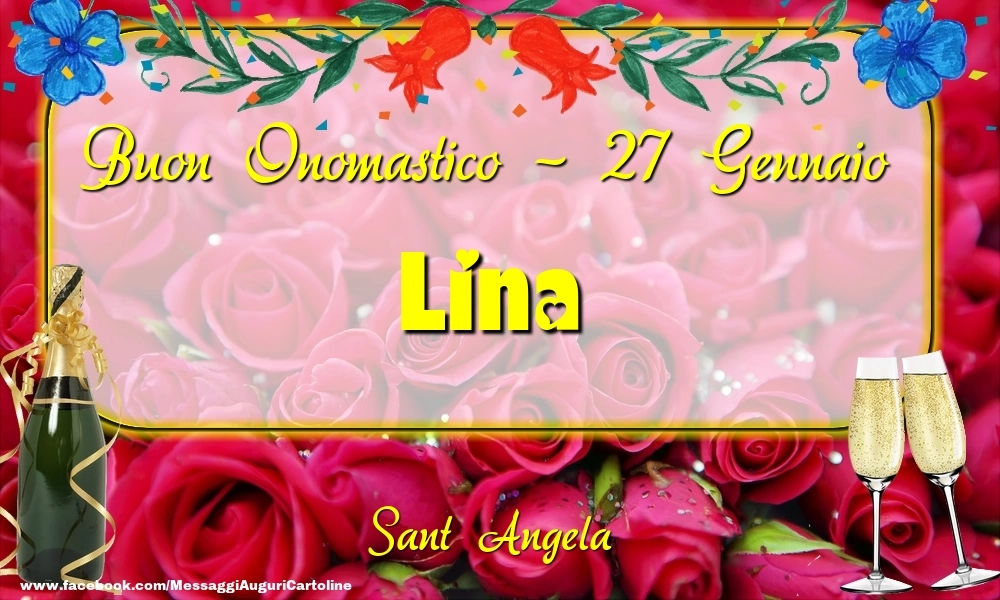 Cartolina con nome Lina di onomastico con champagne con rose rosse sullo sfondo e frase di buon onomastico Sant Angela Buon Onomastico, Lina! 27 Gennaio.