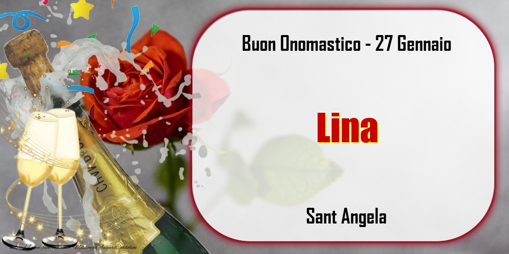 Sant Angela Buon Onomastico, Lina! 27 Gennaio | Cartolina con champagne con bicchieri su sfondo di rose | Cartoline di onomastico