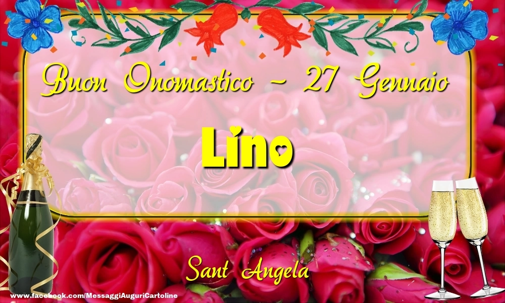 Cartolina con nome Lino di onomastico con champagne con rose rosse sullo sfondo e frase di buon onomastico Sant Angela Buon Onomastico, Lino! 27 Gennaio.