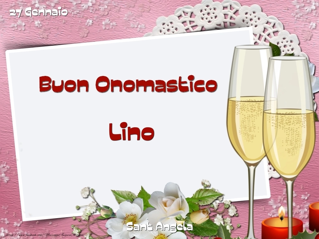 Sant Angela Buon Onomastico, Lino! 27 Gennaio | Cartolina con fiori, bicchieri da champagne e candele | Cartoline di onomastico