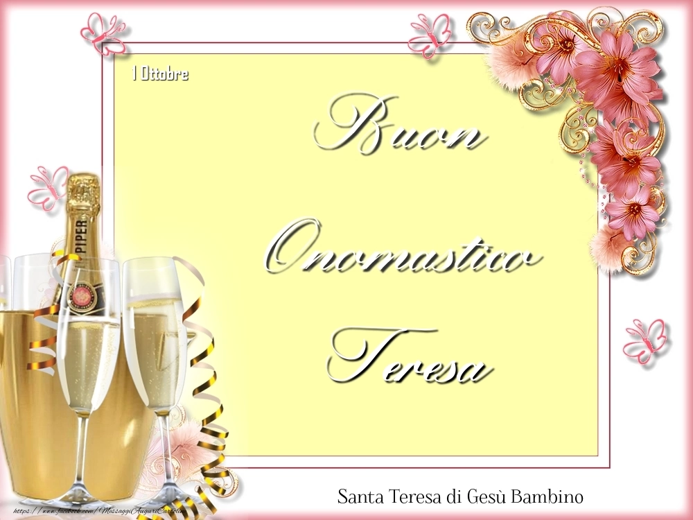 Santa Teresa di Gesù Bambino Buon Onomastico, Teresa! 1 Ottobre | Cartolina con champagne e fiori | Cartoline di onomastico