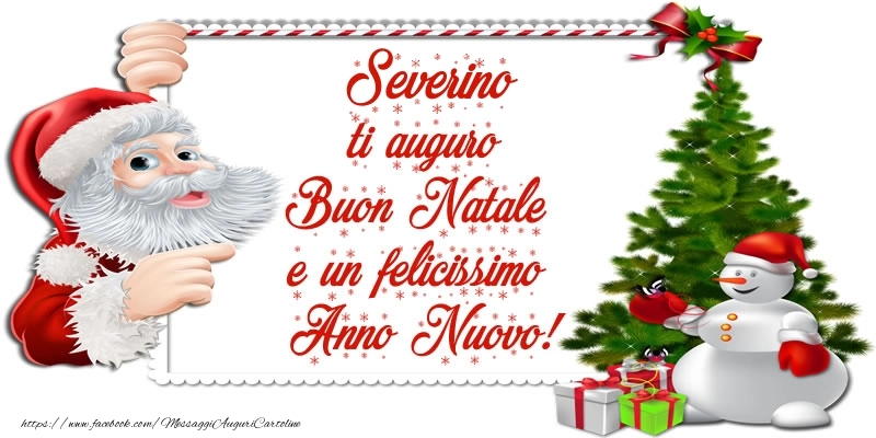Cartolina con nome Severino di Buon Natale con Albero di Natale, Babbo natale e regalo e frase Severino ti auguro Buon Natale e un felicissimo Anno Nuovo!.