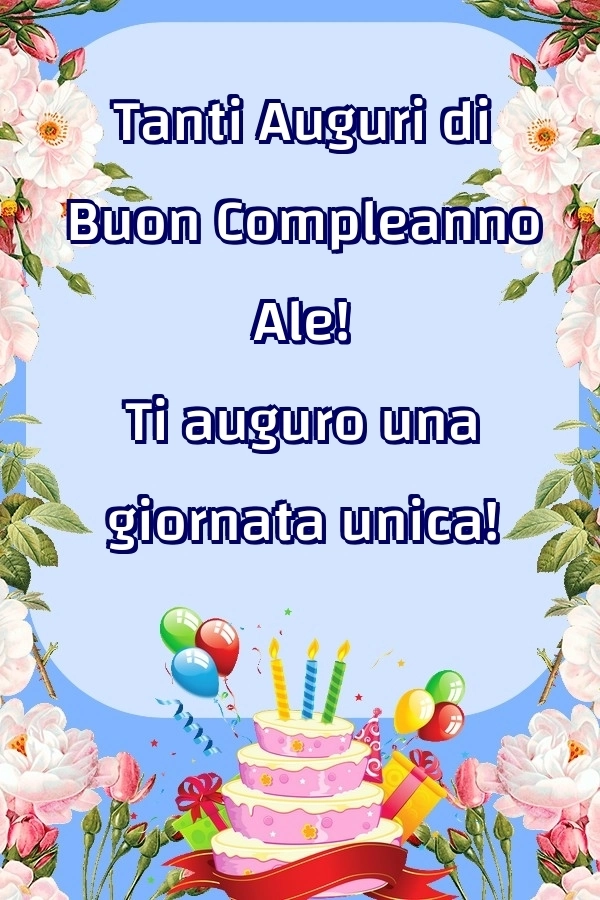 Tanti Auguri di Buon Compleanno Ale! Ti auguro una giornata unica! | Cartolina con torta, palloncini e fiori | Cartoline di compleanno