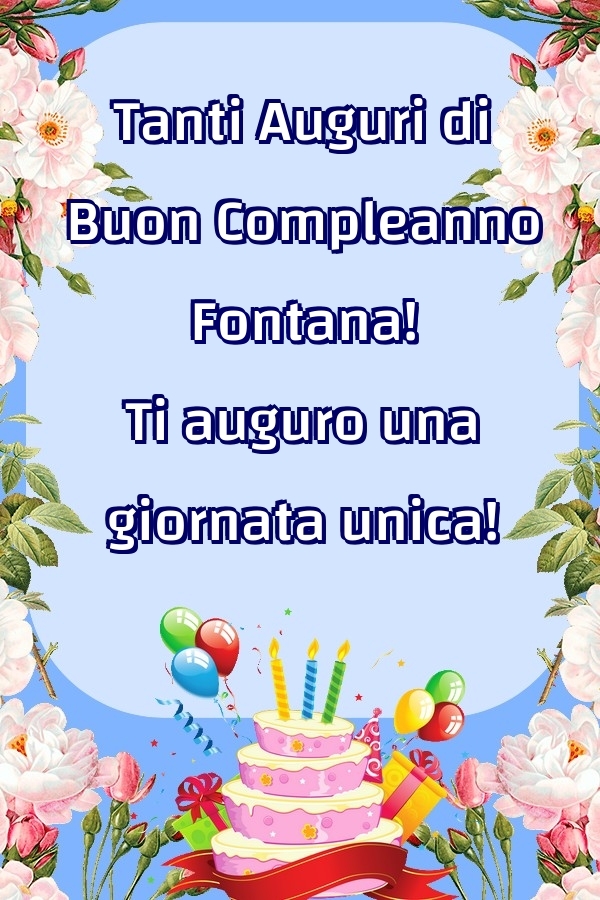 Tanti Auguri di Buon Compleanno Fontana! Ti auguro una giornata unica! | Cartolina con torta, palloncini e fiori | Cartoline di compleanno