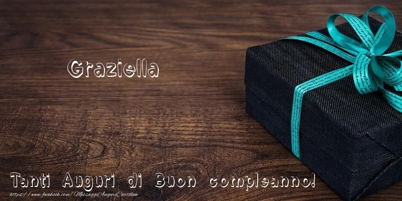 Cartolina con nome Graziella di compleanno con regalo su sfondo di legno vintage e frase di buon compleanno Tanti Auguri di Buon compleanno! Graziella.