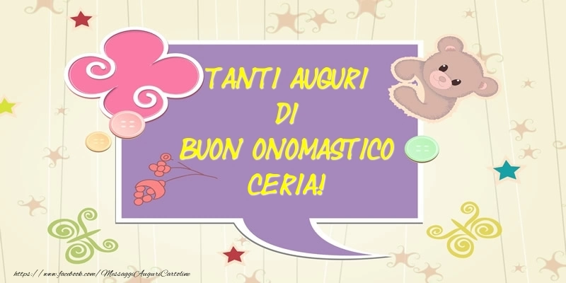 Scopri questa cartolina con orsacchiotto unica e personalizzata per la festa dell'onomastico e preparati a condividere un momento di gioia e felicità con il destinatario. Che tu stia inviando il messaggio a distanza o desideri sorprendere la persona amata, questo biglietto di auguri con il nome Ceria renderà la festa dell'onomastico davvero speciale e memorabile. Questo biglietto di auguri di onomastico con nome Ceria può essere scaricata gratis o inviare tramite Whatsapp, Facebook, Twitter, Pinterest. Immagine di buon onomastico con orsacchiotto e dimensioni 800px x 400px.